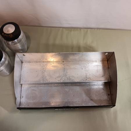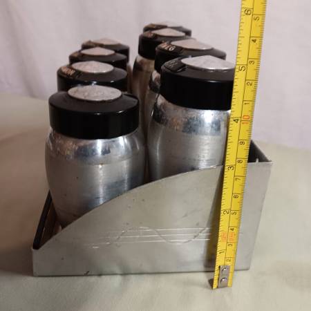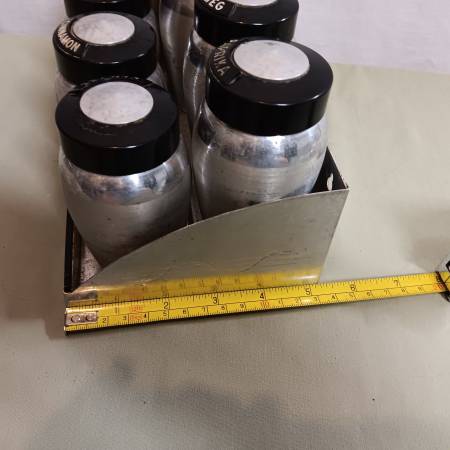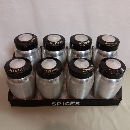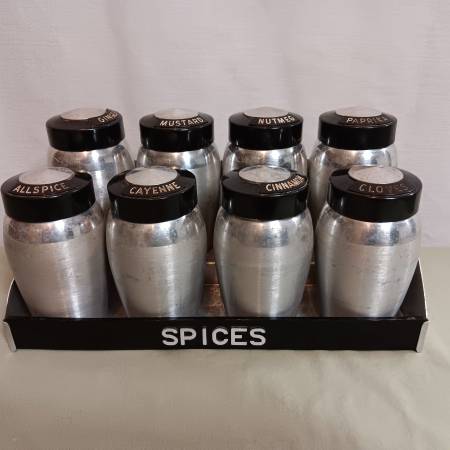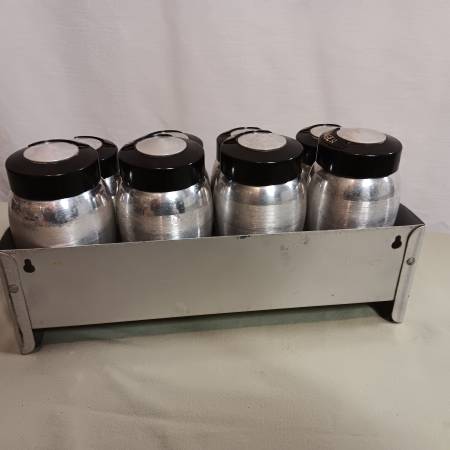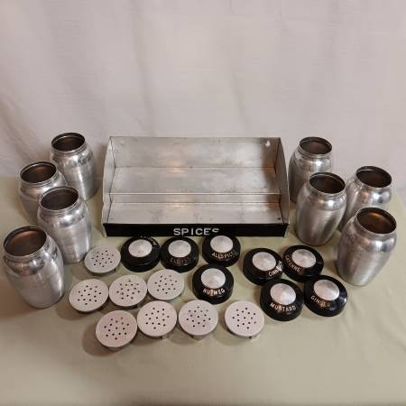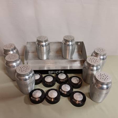 Complete set of eight spice shakers and the rack to hold them. Kromex spun aluminum from the 1950's. I have hand washed these but made no attempt to shine them up. All pieces present including shaker tops.