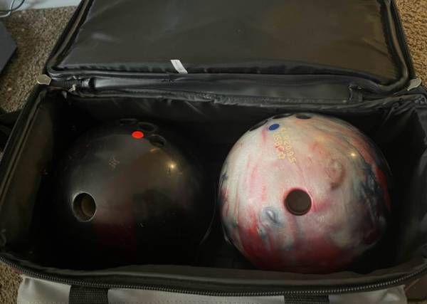 Vintage set of two bowling balls plus bag and gear. All original items in great condition!