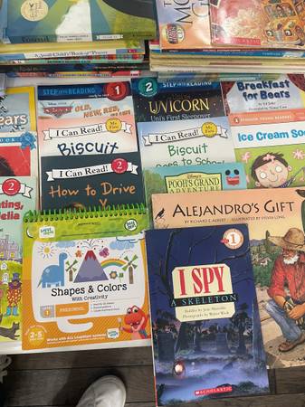 Selling as a set 75 books. Fiction/non-fiction, soft cover, hard cover. Includes: Weather, No David!, Bad Kitty, Jesus, Dinosaurs, Bambi, Sponge Bob, Lightening McQueen, Disney, Cars, Barbie, Lion King, Flat Stanley, Biscuit, I Spy and many more. See the pictures. The list price includes all 75 books.