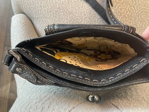 Selling a leather handbag. Pretty clean. Has light use/wear marks. Zipper & magnetic closure. 19-21" drop adjustable. 8" tall x 8.5" wide x 1" deep. Made by Brighton. Pre-owned and in great...
