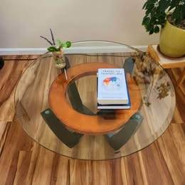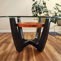 This contemporary coffee table with an orange copper accent and a glass top adds an artful, stylish touch to any living room Measures 34" in diameter and 19" tall