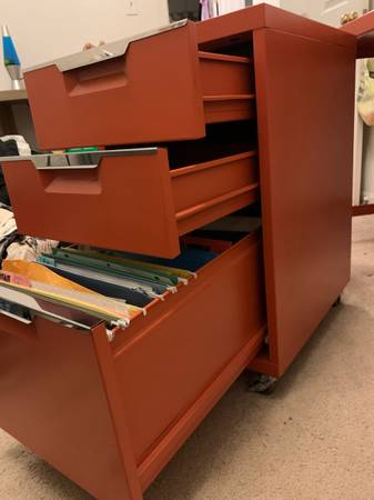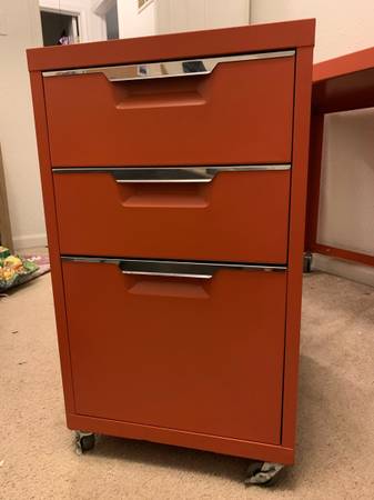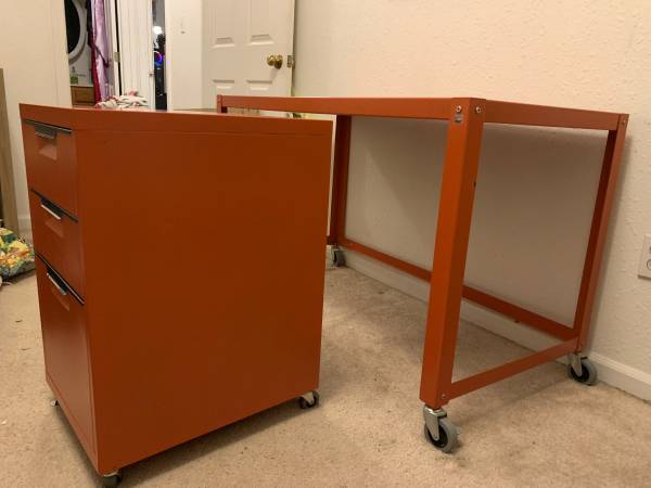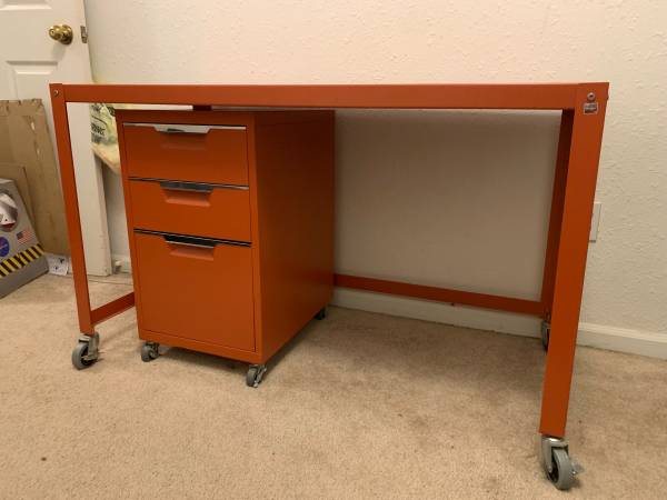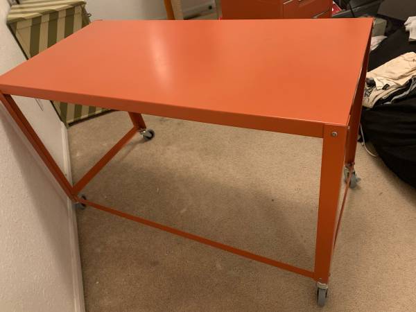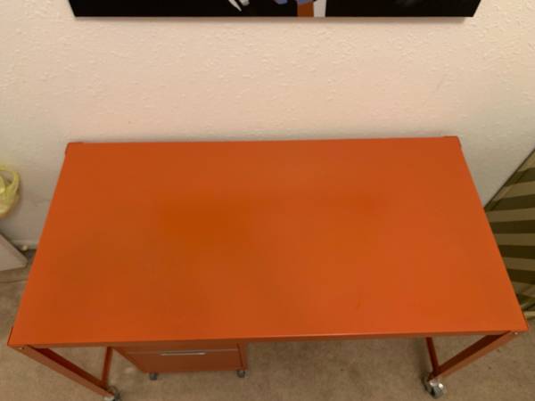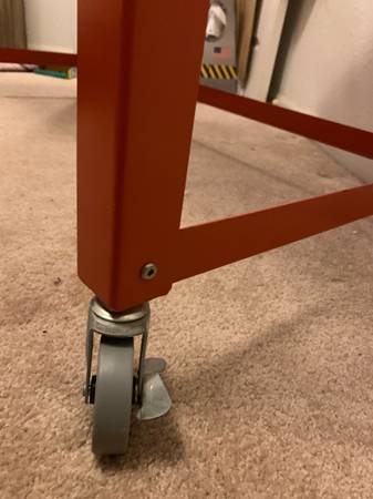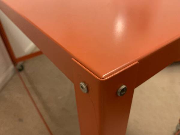 Steel with a bright orange powdercoat finish. Utilitarian design. Four industrial casters; two lock. CB 2 exclusive set;obo; per piece