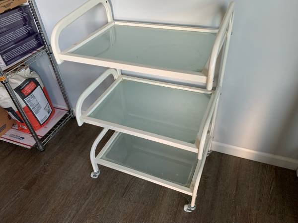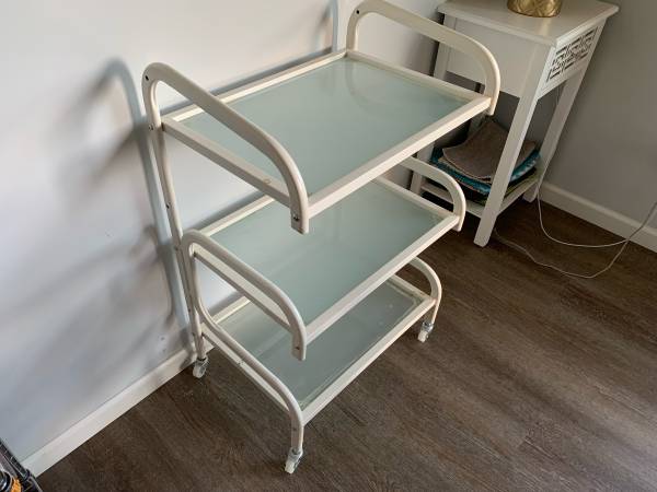 Elegant styling on this tempered glass cart with wheels for maneuverability