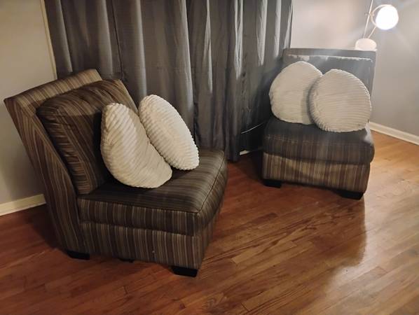 2 chairs with green, beige and burgundy strips available for sale needs to be clean good for some one who needs furniture to start off with and very comfortable