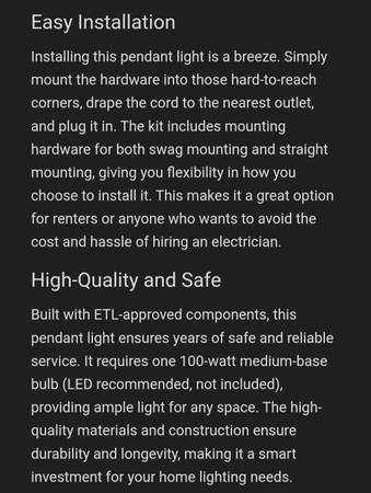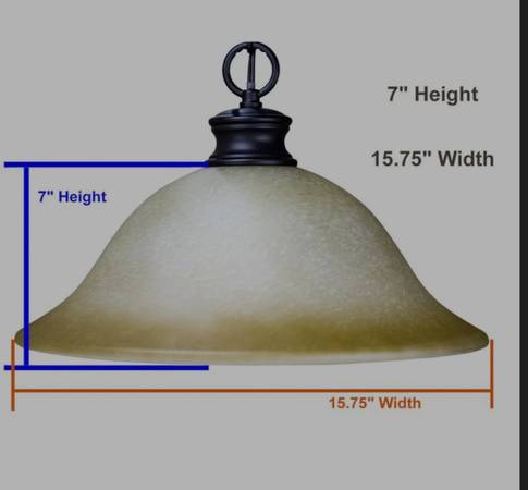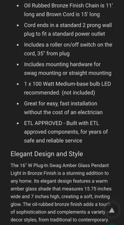 I have a brand new still in box never taken out a very pretty 16"W Plug In Swag Amber Glass Pendant Light Bronze Finish. Everything is included to hang it. No wiring needed. Lights up those dark areas of kitchens or living rooms or really anywhere. Very easy to hang up and plug right into the wall outlet. There's pictures to explain everything about the light. If you have any questions or anything else please message me anytime thanks.
