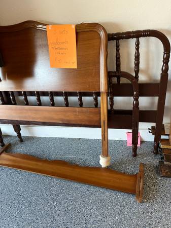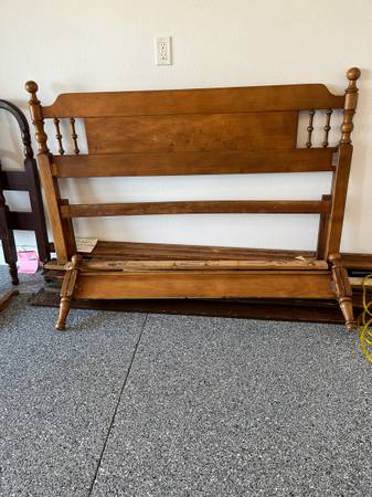 Solid wood. Full size. Should also fit queen size. Includes headboard, matching footboard, side rails. These can be viewed at garage sale Oct. 2-4, 2025, at 833 Ronan Ct.