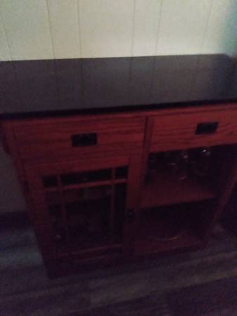 Cherry wine cabinet very pretty,comes with wine glasses,has a marble top and drawers.