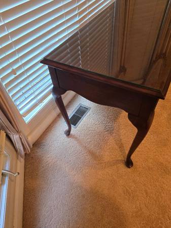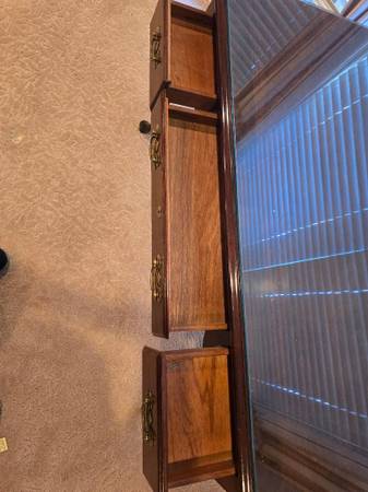 This American Drew Mahogany Office Desk with glass top is a stunning addition to any home or office. The desk features five drawers and a queen Anne style, with a beautiful mahogany finish. The desk is 24 inches long, 29 inches tall, and 46 inches wide, providing ample workspace for any task. Crafted in the United States post-1950, this desk is a high-quality piece of furniture that is perfect for anyone looking for a durable and stylish workspace. The glass top adds a unique touch to the desk, making it a great addition to any home or office decor. Whether you're looking to work from home or just need a stylish desk for display purposes, this American Drew Mahogany Office Desk is the perfect choice.