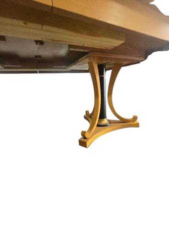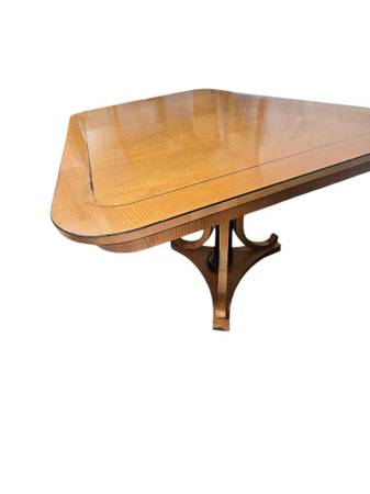 High-end Baker Furniture dining table with a double pedestal base and elegant inlaid top. Super sturdy, beautifully made, and ready for your home. Seats 6–8 people comfortably.