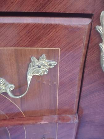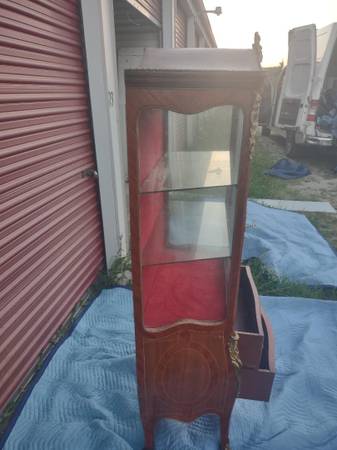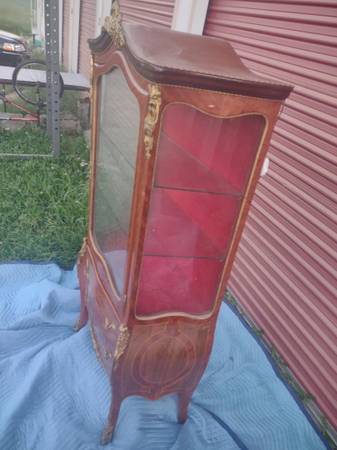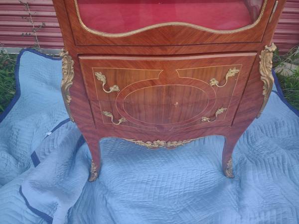 Beautiful French Cabinet with awesome gold trimming. Has 2 glass shelves for displaying your treasures. Does have a working key. Beautiful red velvet background. Has some age appropriate marks as...
