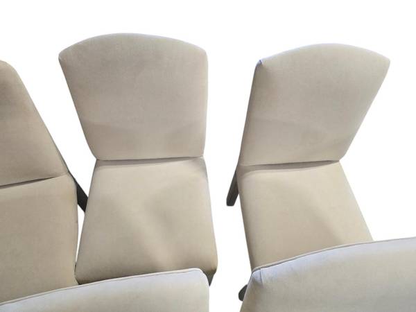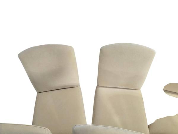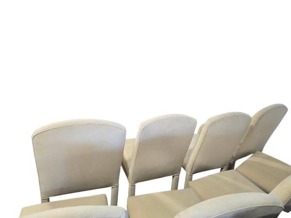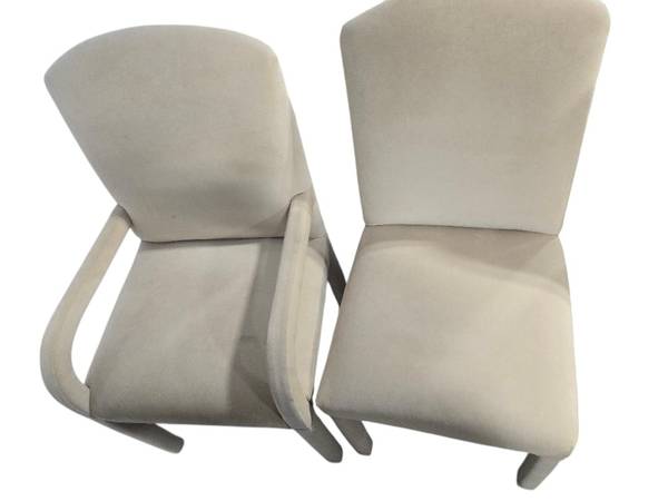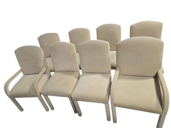 Complete set of 8 dining chairs (6 side chairs + 2 armchairs) in a clean, transitional style. Upholstered in a soft beige microfiber/suede-like fabric with padded seats and backs for comfort. Armchairs feature fully upholstered arms.