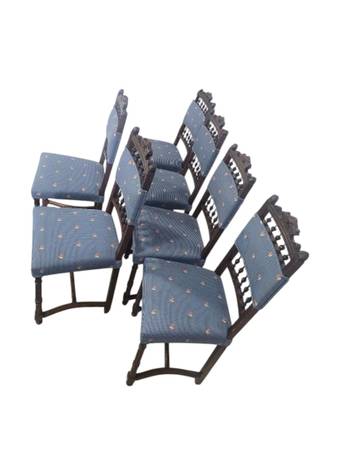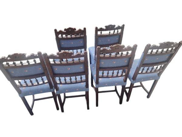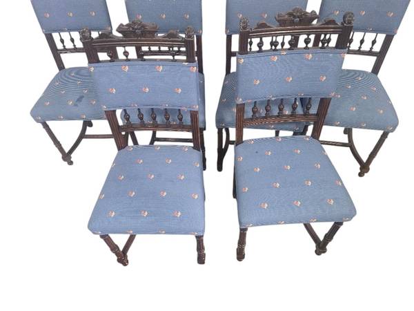 Design Details: Ornate carved backs, turned legs, and stretcher bases for extra stability