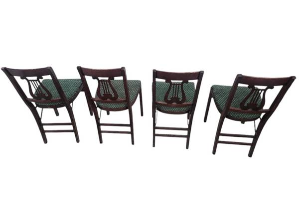 The Set of 4 Stakmore Folding Harp Back Chairs is a vintage collection that exudes elegance and practicality. With their brown color and intricate harp back design, these antique folding chairs are not only stylish but also offer comfort and support for any dining or gathering. At 33 inches in height, 18 inches in depth, and 16 inches in width, these chairs are the perfect addition to any antique-inspired decor.