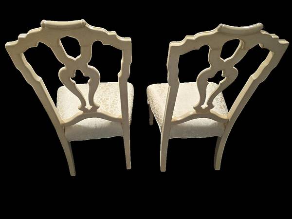 The frames have a lovely antiqued ivory finish with gentle patina that highlights their age and character. Upholstery shows wear consistent with age — perfect candidates for reupholstery to suit your décor.