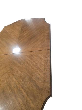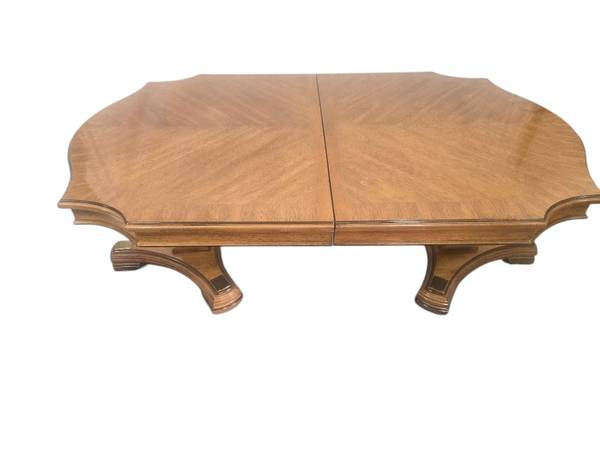 Bring timeless mid-century design into your home with this stunning vintage dining table. Featuring a beautiful bookmatched veneer top with a chevron grain pattern, sculpted pedestal base, and elegant edge detailing, this table is both functional and stylish.