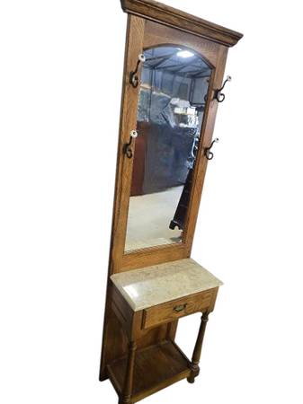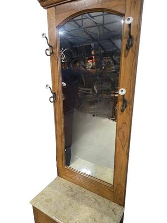 Beveled Mirror: Rectangular mirror with an arched top, common in hall trees of this period.