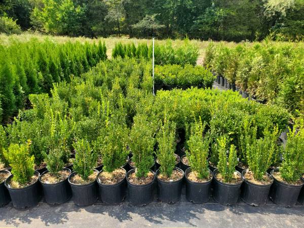 Green Giant Arborvitae. 40-60' x 12-18' pyramid. A favorite for tall hedges and windbreaks.