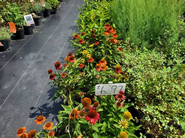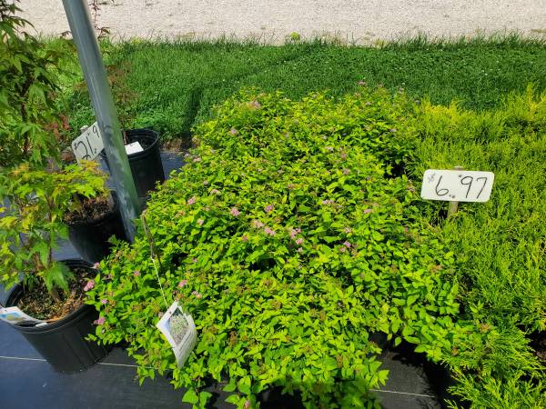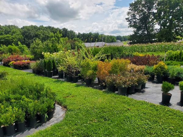 Sedum, rudbeckia, coreopsis, assorted hosta, ornamental grass, coneflowers, astilbe, heuchera, dianthus, allium, butterfly weed, daylilies, (4 colors), creeping phlox, (purple, white, magenta). Purple and white lilacs, arborvitae, mock orange, juniper, beautyberries, viburnum, rose of sharon, burning bush, spirea, and hydrangea.