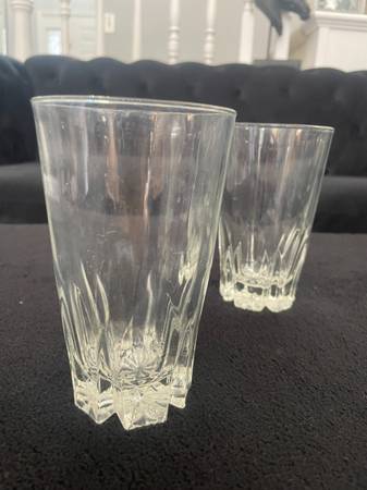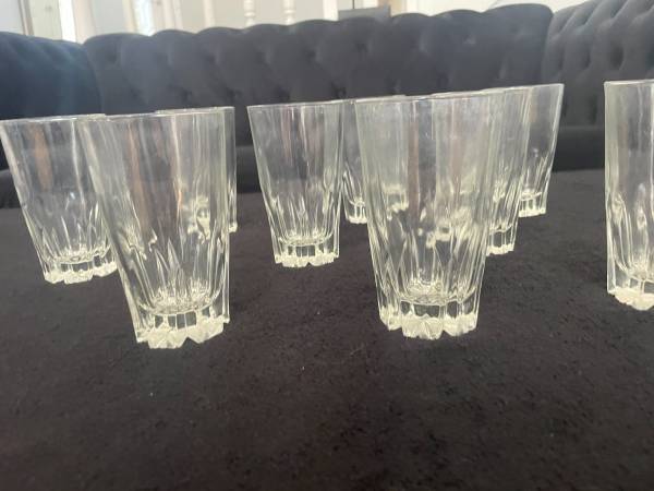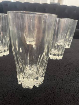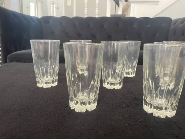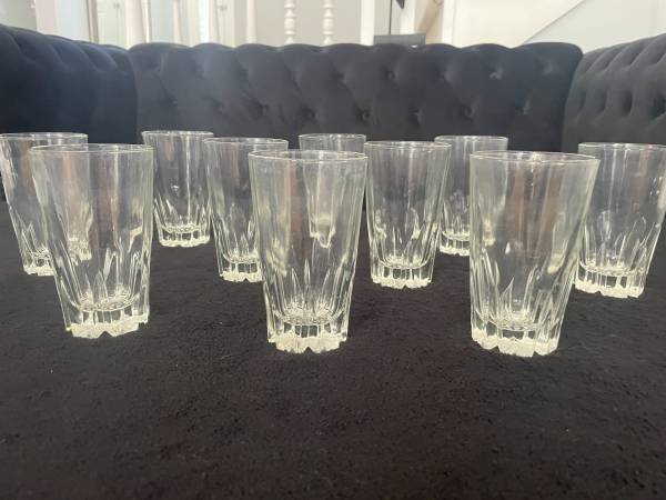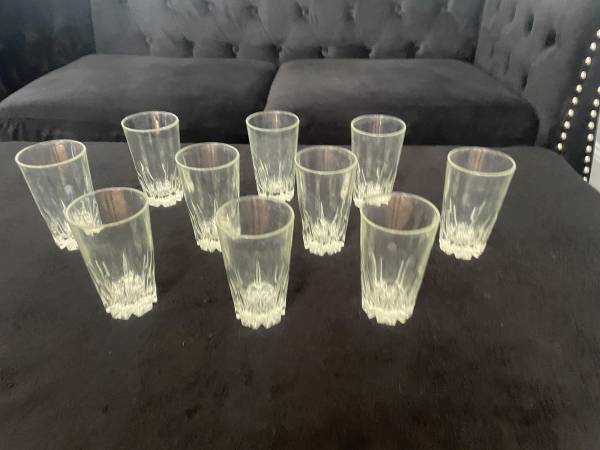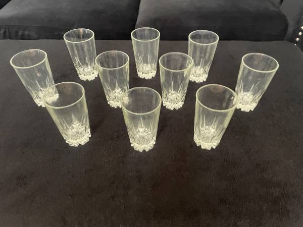 Selling a set of 10 glasses. Clear color, ornate laser cut base. Good pre-owned condition. There are light use/wear/cloudiness from age. The list price is for all 10 glasses.