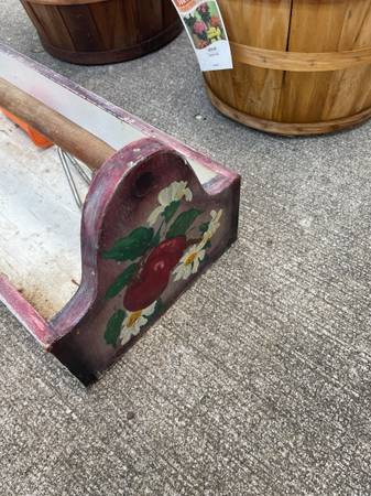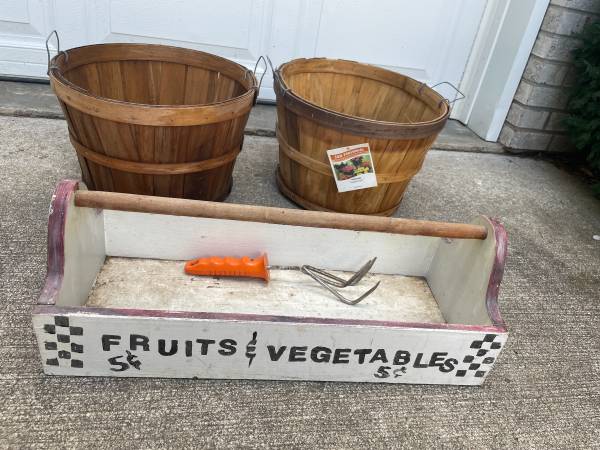 4 piece garden set. Includes 12" claw hand tool, 23x10" wooden carrier with handle and 2 baskets each 9" tall x 14" diameter. All in good pre-owned condition. There are use/wear marks. The list...