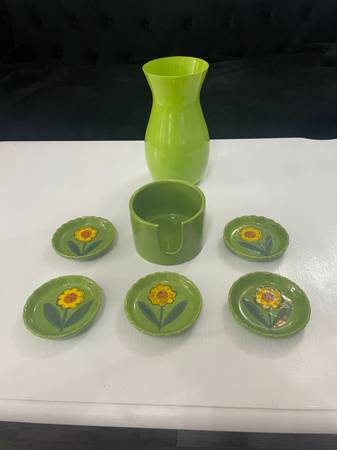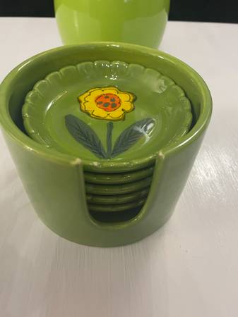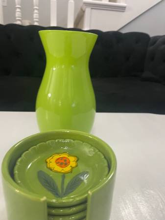 Selling as a set 5 green ceramic canape plates and holder and vase. Plates 4" diameter. Vase 9" tall. Pre-owned and in good condition. Vase has light use/scratches. The plates have 2 small chips....