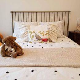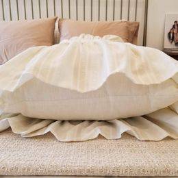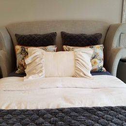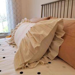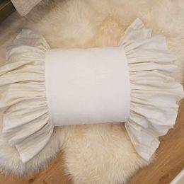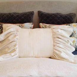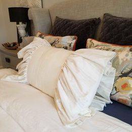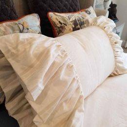 LARGE CUSTOM MADE BEAUTIFUL ACCENT PILLOW WITH WIDE RUFFLED/GATHERED EDGES IN NEUTRAL COLORS OF WHITES AND TANS COMFY & SOFT Ruffles are 10" wide on each side Middle section is 14 3/4"...