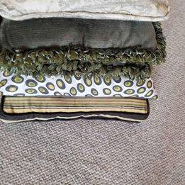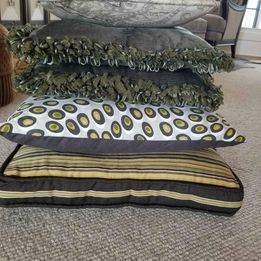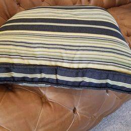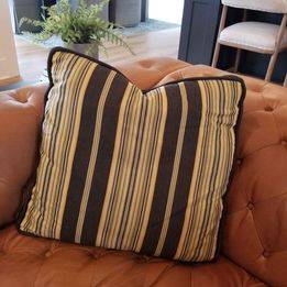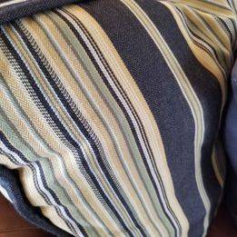 CUSTOM MADE MODERN BOXED STYLE PILLOW WITH VARIOUS SIZE STRIPING IN GREENS, GOLDS, YELLOWS, BLACKS, GREYS
