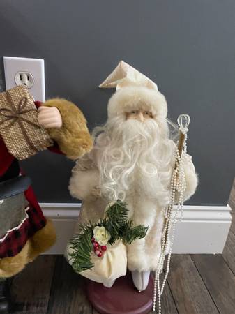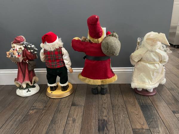 Selling as a group 4 Santas. They are...Hard plastic bell ringer; old world white coat; hip swinging; and traditional Santas. They are pre-owned are in good condition overall. I cannot get the animation and musical parts work on any of them. The hip swinging Santa has a broken joint at one of his elbows. I can feel it under his shirt sleeve. They are being sold "as is" statues.