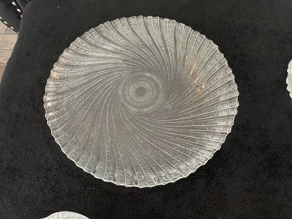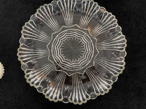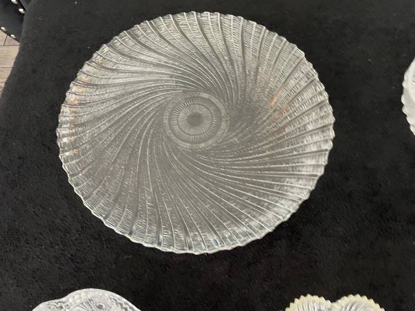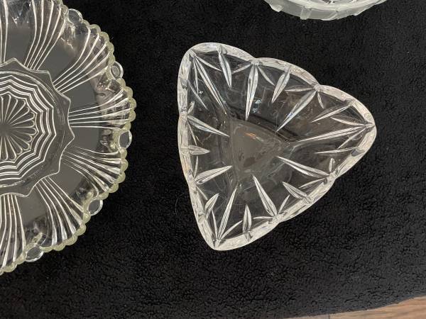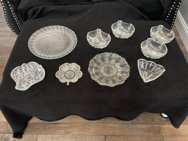 Selling as a bulk set 9 pieces of glass bowls and platters. Includes: Triangle dish 6x6". 4-Onion Bowls 6x6". Swirl platter 13". Platter with flower 10". Seashell shaped cut glass tray 7.5x7.5". Clover dish 6x6". Pre-owned and in good condition. No cracks or chips. The list price is for all 9 pieces.