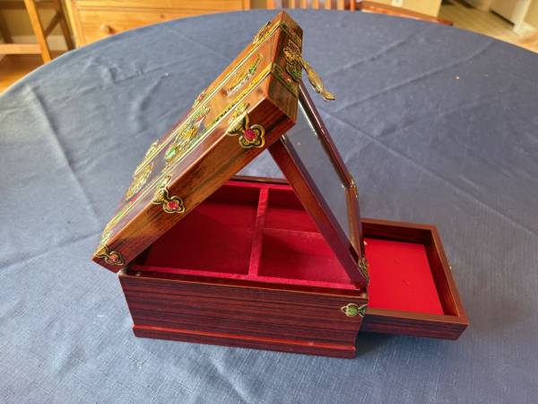 Unusual, large jewelry box from Asia. Chinese character on lid means "good fortune." Includes 3 compartments and a swivel mirror on top level and a drawer in bottom. Excellent condition. A perfect gift.