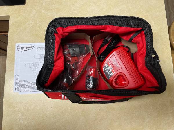 Brand new Milwaukee M12 Fuel Hammer Drill / Driver. Comes with tool, (1) 12v 2AH battery, charger, toolbag, and manual. New and never used. Price for tool only is $150 at Home Depot. Get the charger...