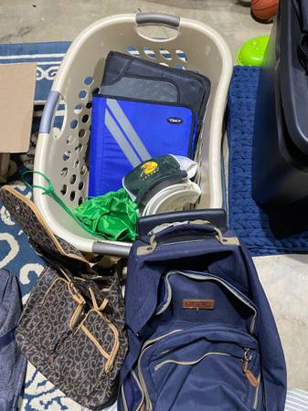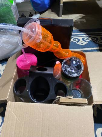 Misc box filled with cups, blow dryer and brush holder, Fingernail polish dryer (missing the cord easy replacement) k-cup drawer.